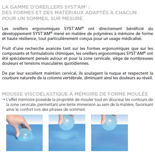 L' effet mémoire possède la propriété de mouler tout en douceur les contours de la zone cervicale, permettant une lente immersion au sein de la matière, favorisant ainsi l' allègement des pressions sur la nuque et le confort lors des phases de sommeil.